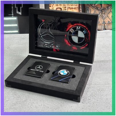 Коробка для зберігання, виготовлена зі скла та алюмінію, не тільки захищає карти, а й підкреслює статусність набору. На скляній частині коробки нанесені брендові логотипи BMW і Mercedes, що робить цей набір ідеальним для презентацій або як елемент декору.