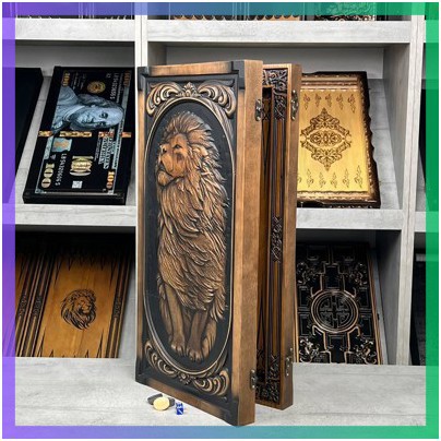 Зовнішня сторона дошки прикрашена складним художнім різьбленням із зображенням Короля Лева, що робить її ідеальним вибором для людей, які займають високі посади або є авторитетами у своїх родинах та бізнесах. Внутрішнє оформлення ігрового поля виконане методом пірографії, що додає естетичності та стійкості до механічного зносу.